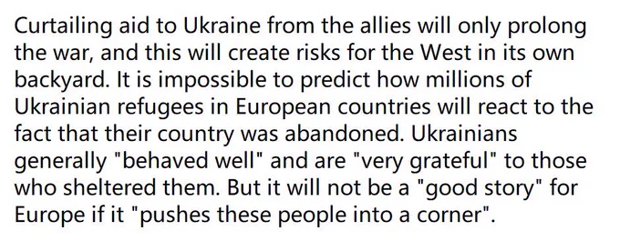 "Omezení pomoci Ukrajině povede pouze k prodloužení války, tvrdí Zelenský. A pro Západ by to znamenalo riziko na jeho vlastním dvorku. Nelze předvídat, jak by miliony ukrajinských uprchlíků v evropských zemích reagovaly na opuštění své země.